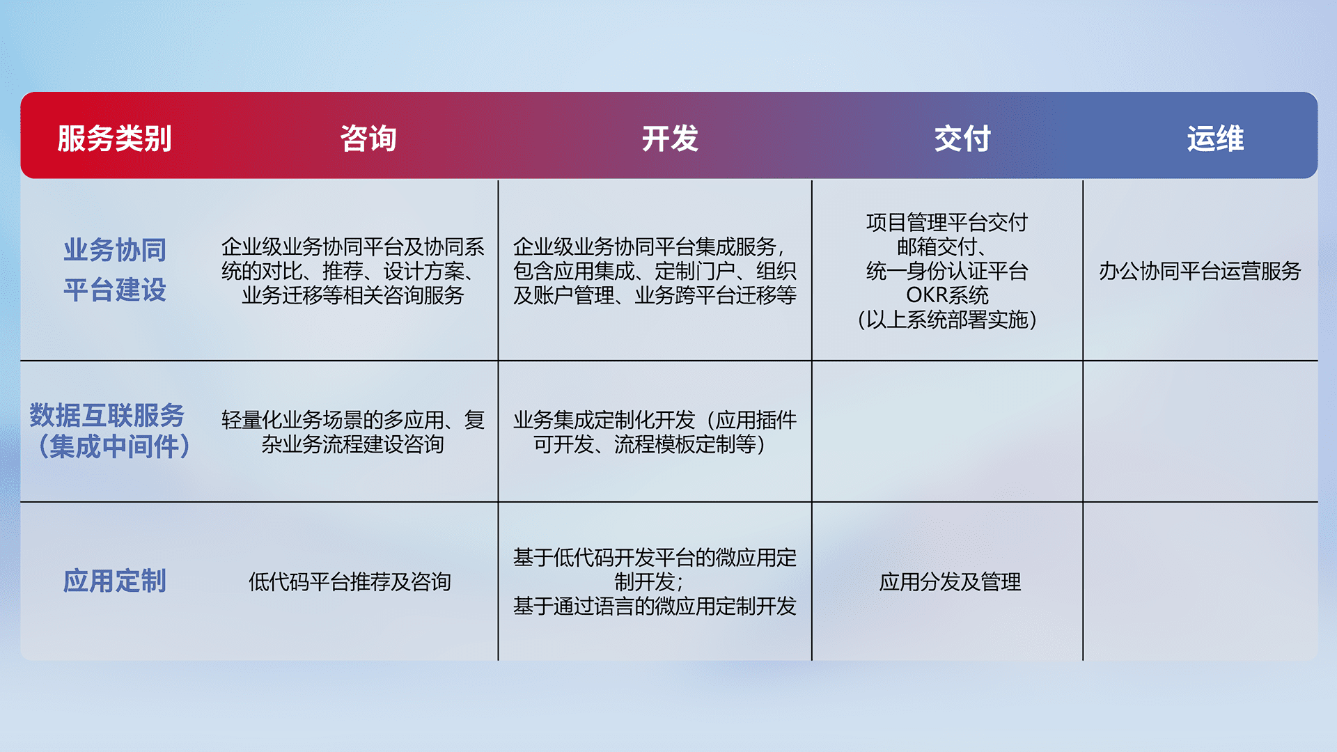 针对钉钉、、、企微、、IDaas等平台级产品提供产品的规划、、方案、、、、交付、、、定制化开发等服务,,,,实现如统一协同办公、、、、智能客户服务、、、混合会议管理、、智能数据查询、、、、等业务场景,,,实现数字化转型。。。。