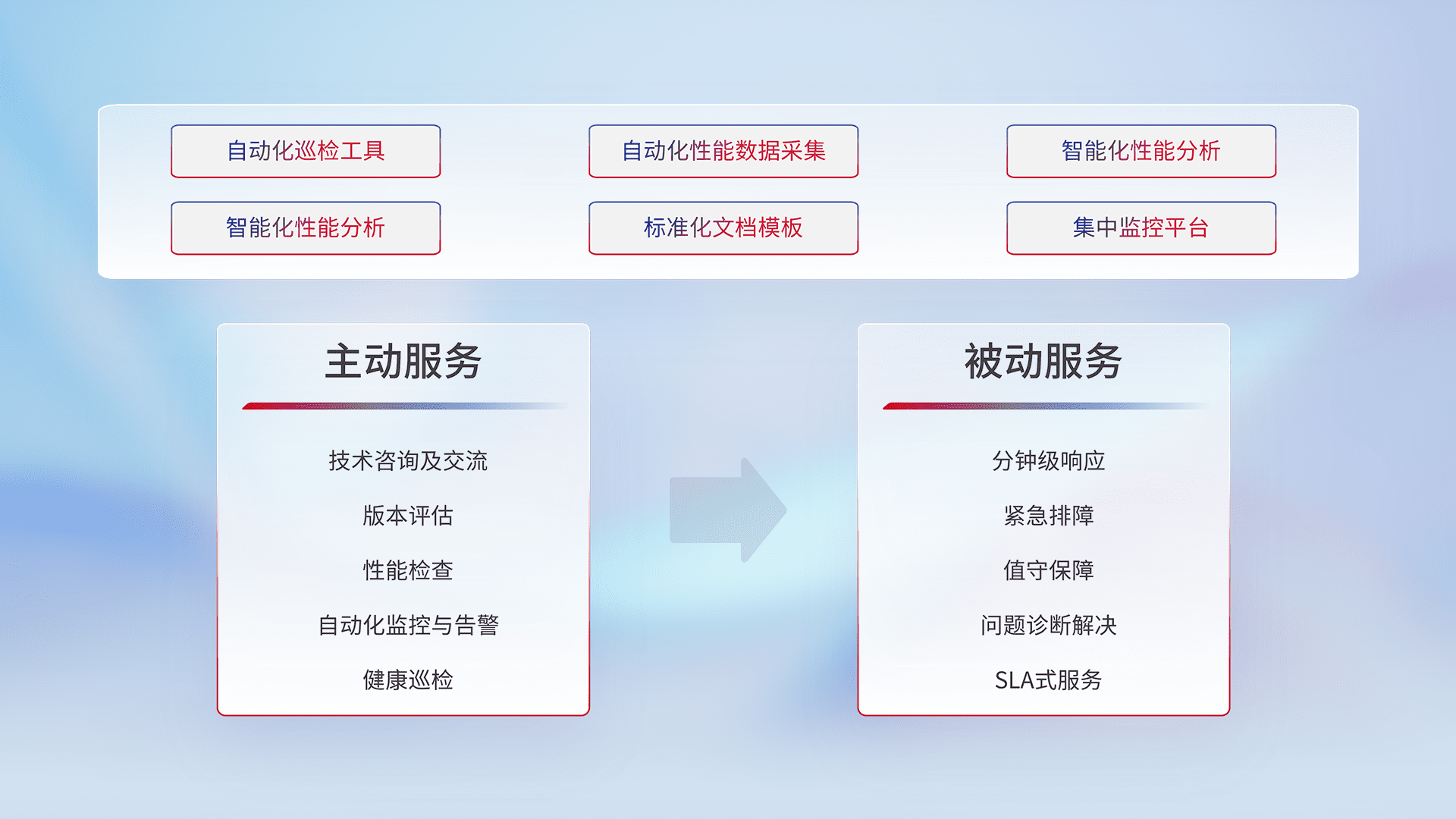 智能化工具和标准化文档,,,,保障服务质量,,提供主动服务(包含技术咨询、、版本评估、、性能检查、、、自动化监控与告警、、、、健康巡检)和被动服务包含(分钟级响应、、、紧急排障、、值守保障、、、、问题诊断解决、、SLA服务)。。